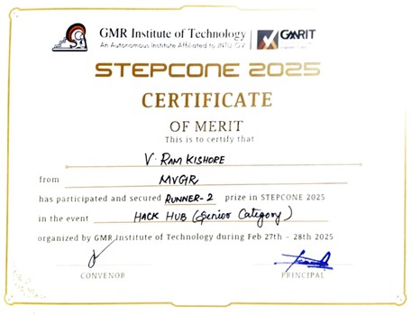 Vizianagaram, March 1, 2025: MVGR College of Engineering is proud to announce that its students have secured the Runner-up position in the prestigious HackHub event at STEPCONE 2025, hosted by GMR Institute of Technology (GMRIT). Their remarkable dedication, teamwork, and innovation have brought significant recognition to the institution.